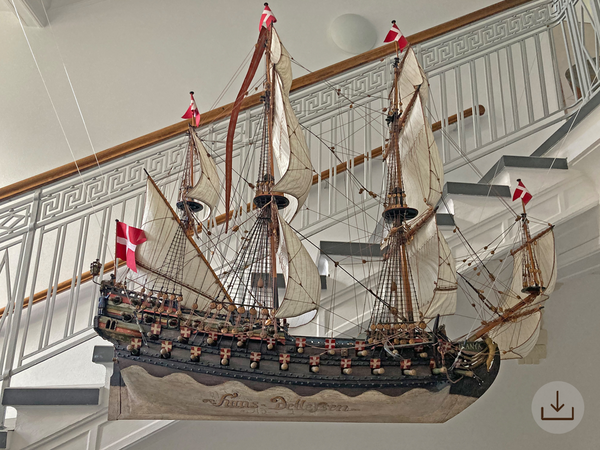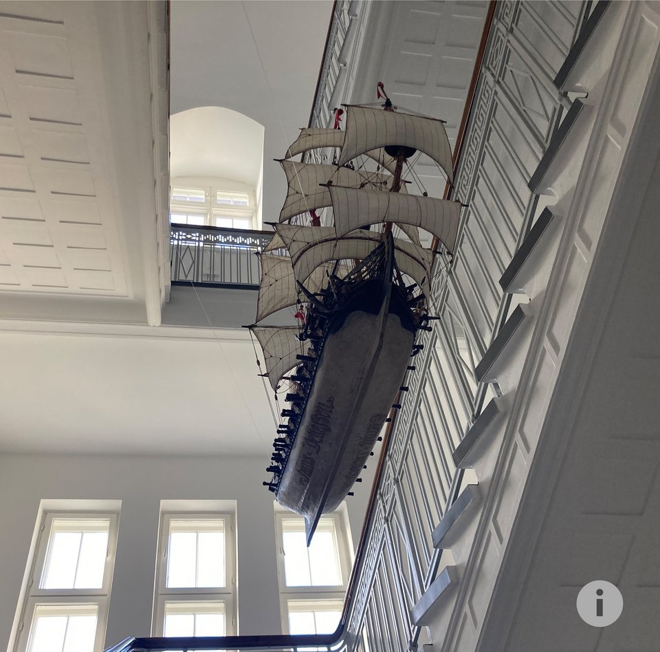 Euer Weg führt euch zuerst ins Hinterhaus. Glücklicherweise ist die Tür nicht abgeschlossen und ihr kommt ohne Probleme in das alte Treppenhaus. Da seht ihr es schon von unten: das Schiff aus dem Plan mit dem Namen Hans Detlefsen am Schiffsrumpf! Es handelt sich um das alte Votivschiff URANIA.